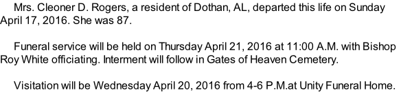 To order memorial trees or send flowers to the family in memory of Cleoner D. Rogers, please visit our flower store.