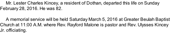 To order memorial trees or send flowers to the family in memory of Lester Charles Kincey, please visit our flower store.
